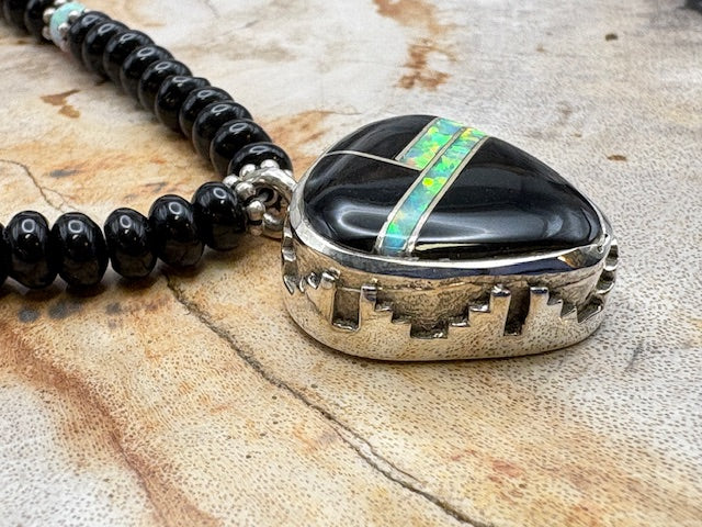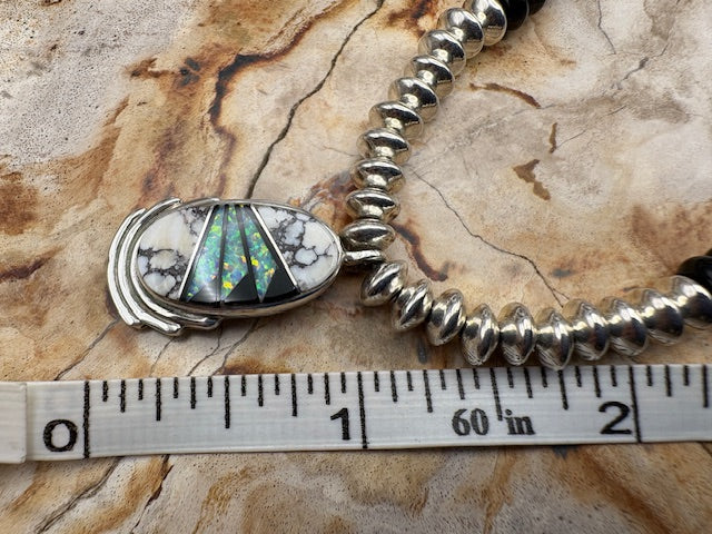 This two piece pendant is hand inlaid with gaspeite, spiny oyster, opal, turquoise, sugilite, and jet stones. The circular portion of this sterling silver piece...