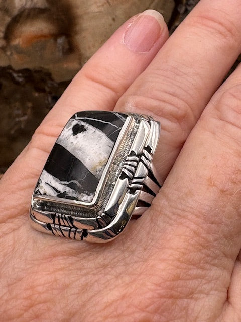 Dainty, contemporary style white opal and sterling silver ring for someone looking for a more subdued approach to Native American jewelry. Opal has flashes of...