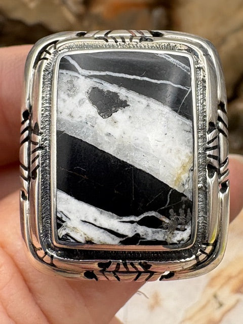 This gorgeous Navajo Sugilite Sterling Silver Ring is surrounded in detailed stamping. It has a five slit shank and is signed Aaron Toadalena. Size 6...