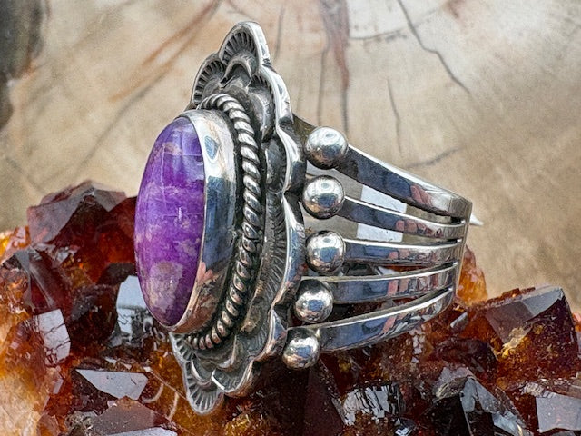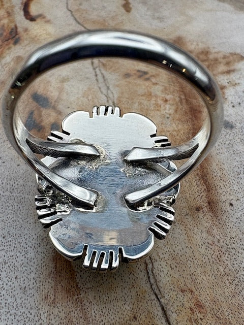 Whimsical Kokopellis flank a 1/4" lapis lazuli stone on this sterling silver ring. The band is 3/8" at its widest point. Navajo artist Julius Burbank...
