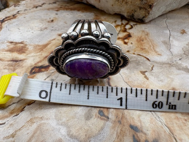 This stunning Navajo sterling silver ring features an emerald cut blue topaz stone set in intricate silverwork. The stone measures 5/8" by 1/2". It is a...